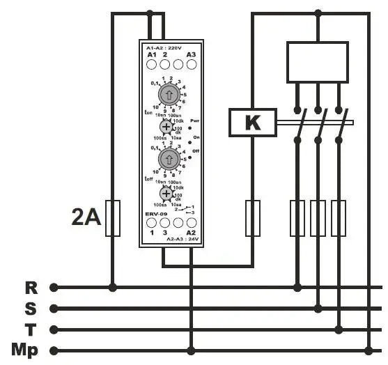 Si configura el relé de modo que sus tiempos de conexión y pausa sean simétricos, puede utilizarse, por ejemplo, para conectar gradualmente determinados aparatos eléctricos en caso de limitaciones de corriente/potencia (calefactores, generadores de calor). La presencia de un contacto de salida de conmutación permite iniciar el ciclo por impulsos o con una pausa.