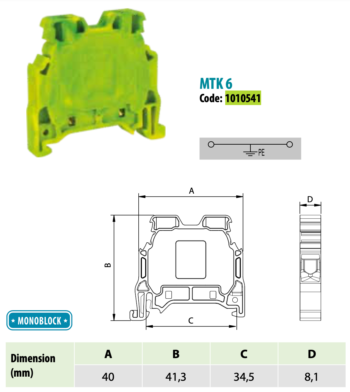 ONKA 6mm2 PE Regleta de bornes para carril DIN 2 hilos gris, 1010541
