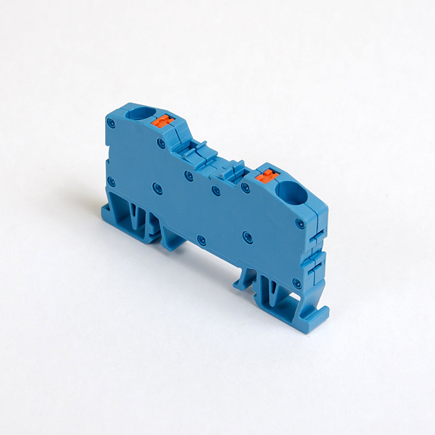 Conector de muelle para barras colectoras / borne para carril DIN 2 hilos, contacto escamoteable, azul, ONKA, made in Turkey.