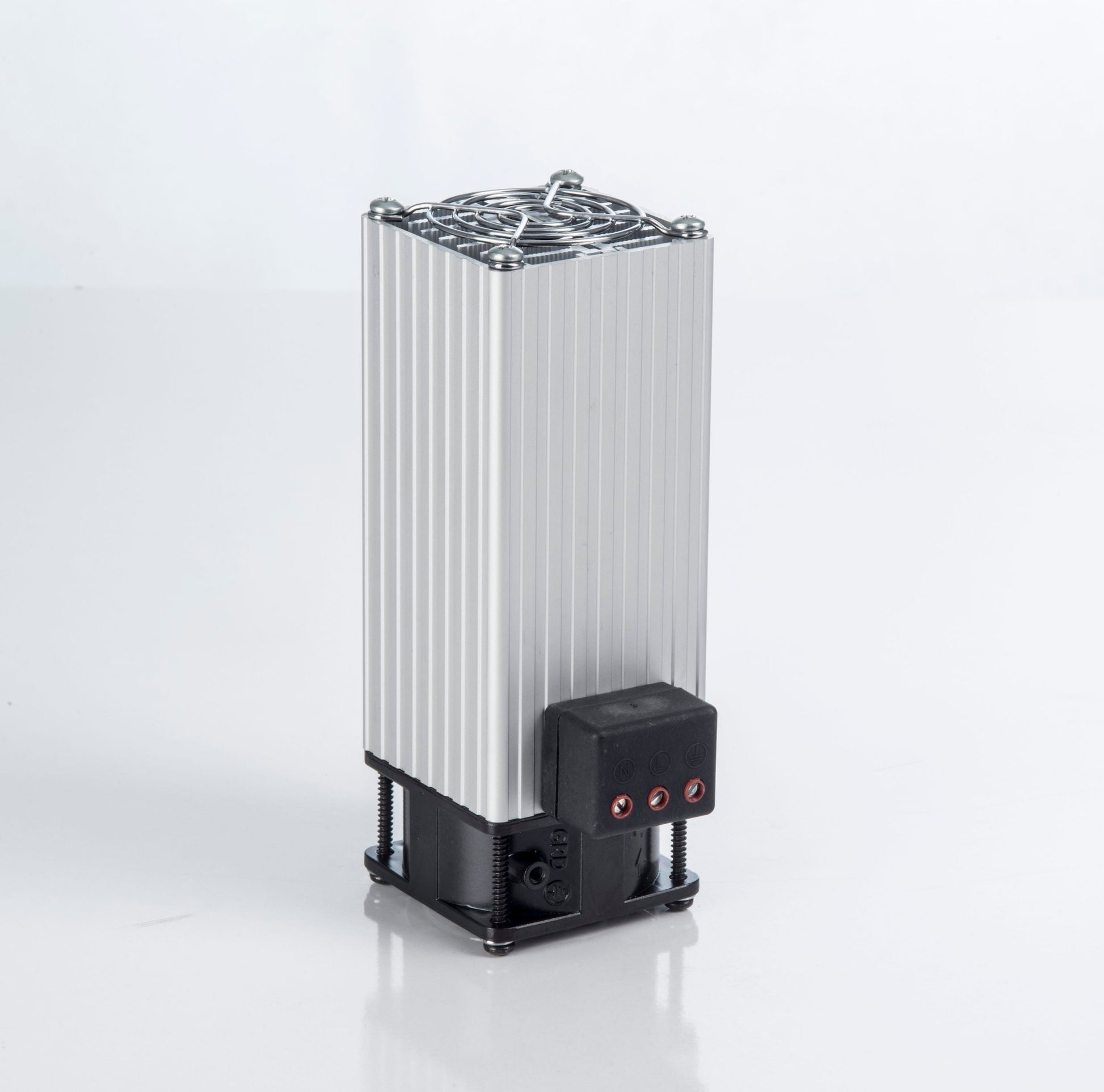 Calentador eléctrico (PTC Body Heater, calentador de postensión) para cuadros eléctricos con ventilador, con disipador de calor de aluminio anodizado y protección contra sobrecorriente, para instalación en carril DIN con 100 vatios, 220/230 voltios CA, PFHT100, Plastim - fabricado en Turquía.